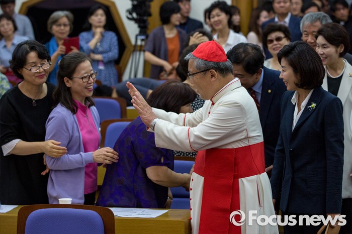 (서울=포커스뉴스) 염수정 추기경과 나경원 새누리당 의원이 4일 오전 서울 여의도 국회의원회관에서 열린 '생명존중포럼 창립총회'에 참석하기 위해 총회장으로 들어서고 있다.