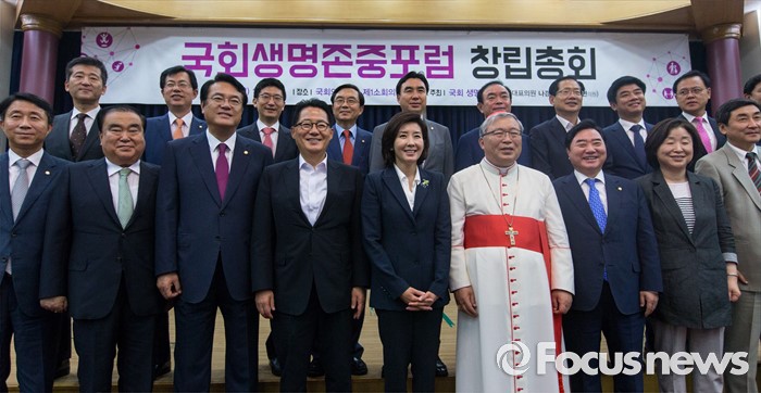 (서울=포커스뉴스) 염수정(왼쪽 여섯 번째) 추기경을 비롯한 국회 카톨릭교우회 소속 의원들이 4일 오전 서울 여의도 국회의원회관에서 열린 '생명존중포럼 창립총회'에 참석해 총회를 마친 뒤 사진촬영을 하고 있다. 왼쪽부터 조정식 더불어민주당 의원, 문희상 더불어민주당 의원, 정진석 새누리당 원내대표, 박지원 국민의당 비상대책위원장, 나경원 새누리당 의원, 염수정 추기경, 이석현 더불어민주당 의원, 심상정 정의당 상임대표, 이종걸 더불어민주당 의원.