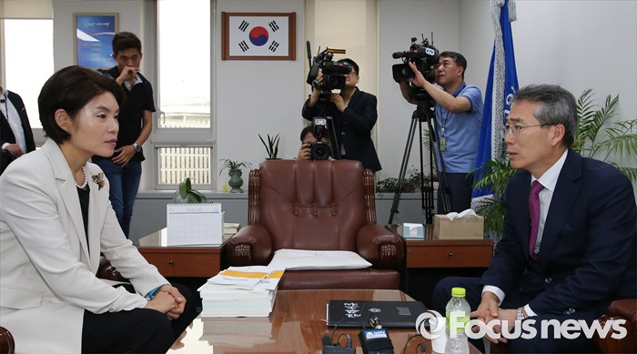 (세종=포커스뉴스) 국회 환경노동위원회 한정애 더불어민주당 간사가 4일 오후 세종시 정부세종청사 최저임금위원회를 찾아 박준성 위원장과 면담을 나누고 있다.