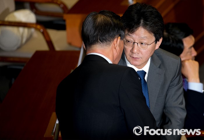 (서울=포커스뉴스) 4일 오후 서울 여의도 국회에서 열린 343회 국회(임시회) 6차 본회의, 경제에 관한 대정부 질문에 참석한 유승민(오른쪽), 홍문표 새누리당 의원이 대화하고 있다.