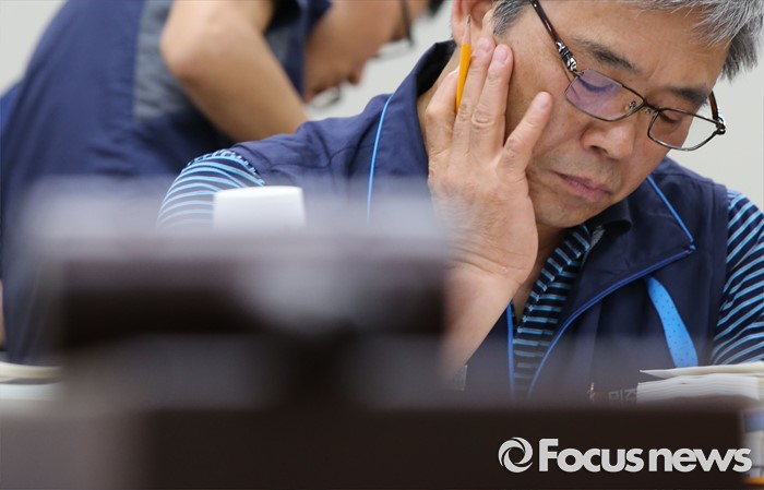 (세종=포커스뉴스) 4일 오후 세종시 정부세종청사 고용노동부 최저임금위원회 전원회의실에서 열린 제8차 전원회의에서 근로자 위원이 자료를 살피고 있다.