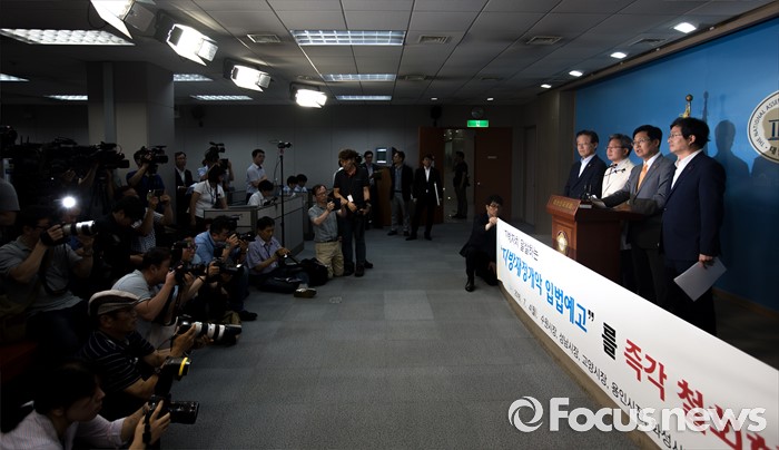 (서울=포커스뉴스) 경기지역 시장들이 4일 오후 서울 여의도 국회에서 행정자치부의 지방재정법 시행령 개정안 입법예고 철회를 촉구하는 기자회견을 하고 있다. 왼쪽부터 이재명 경기도 성남시장, 채인석 경기도 화성시장, 최성 경기도 고양시장, 염태영 경기도 수원시장.
