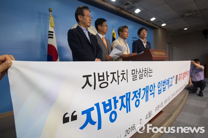 (서울=포커스뉴스) 경기지역 시장들이 4일 오후 서울 여의도 국회에서 행정자치부의 지방재정법 시행령 개정안 입법예고 철회를 촉구하는 기자회견을 하고 있다. 왼쪽부터 이재명 경기도 성남시장, 최성 경기도 고양시장, 채인석 경기도 화성시장, 염태영 경기도 수원시장.
