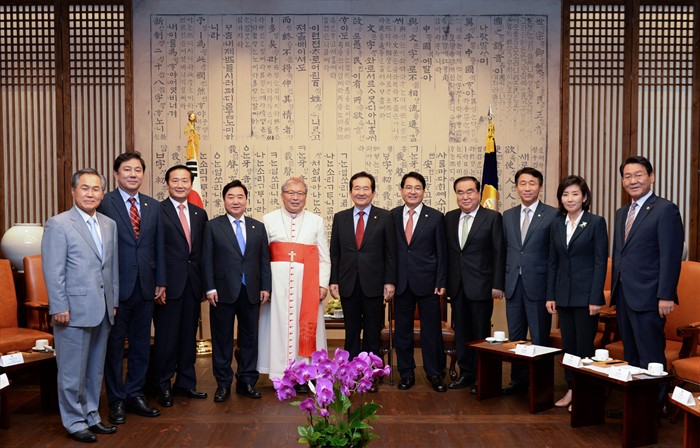 (서울=포커스뉴스) 정세균(오른쪽 여섯번째) 국회의장과 의원들이 4일 오후 서울 여의도 국회에서 염수정(왼쪽 다섯번째) 추기경을 접견, 기념촬영을 하고 있다. <사진제공=국회>