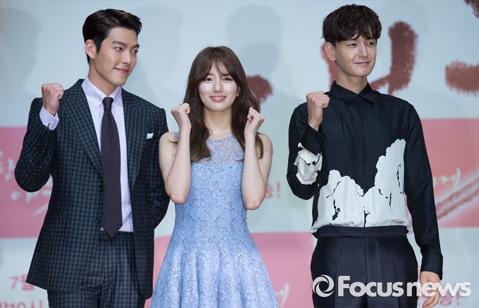 (서울=포커스뉴스) 4일 오후 서울 용산구 하얏트호텔 그랜드볼룸에서 열린 KBS 특별기획드라마 '함부로 애틋하게' 제작발표회에 참석한 배우 김우빈(왼쪽부터), 배수지, 임주환이 포토타임을 갖고 있다.