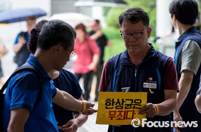 (서울=포커스뉴스) 4일 오후 서울중앙지법 앞에서 한상균 민주노총 위원장의 1심 선고 공판 후 열린 기자회견에 참석한 최종진 부위원장이 관계자로부터 '한상균은 무죄다'가 적힌 손팻말을 받고 있다. 지난해 11월 열린 민중총궐기 대회 불법 시위 주도 혐의로 기소된 한 위원장은 이날 열린 1심 재판에서 징역 5년을 선고받았다.