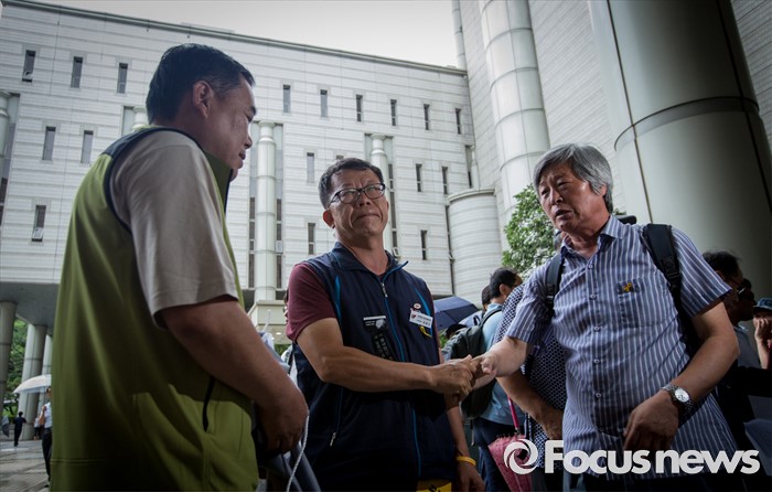 (서울=포커스뉴스) 4일 오후 서울중앙지법 앞에서 한상균 민주노총 위원장의 1심 선고 공판 후 열린 기자회견을 마친에 참석한 최종진 부위원장 및 조합원들이 인사를 나누고 있다. 지난해 11월 열린 민중총궐기 대회 불법 시위 주도 혐의로 기소된 한 위원장은 이날 열린 1심 재판에서 징역 5년을 선고받았다.