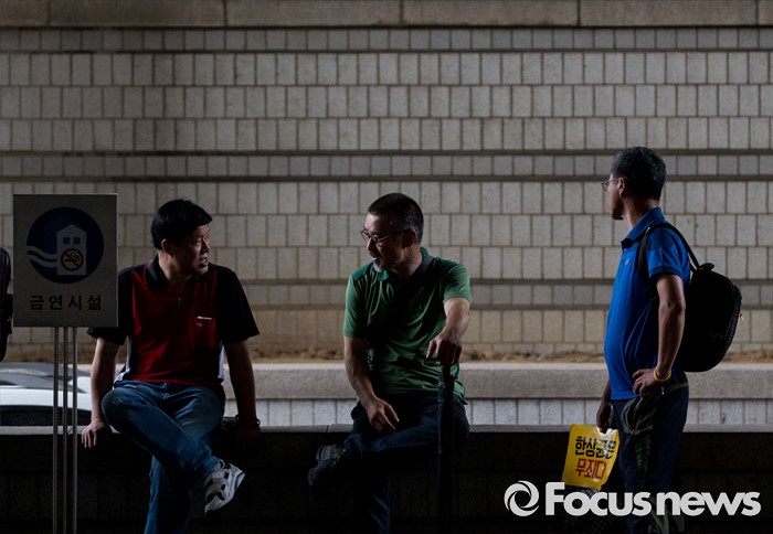 (서울=포커스뉴스) 4일 오후 서울중앙지법 앞에서 민주노총 조합원 및 관계자들이 한상균 위원장의 1심 선고 공판 방청 후 기자회견을 갖기 위해 기다리고 있다. 지난해 11월 열린 민중총궐기 대회 불법 시위 주도 혐의로 기소된 한 위원장은 이날 열린 1심 재판에서 징역 5년을 선고받았다.