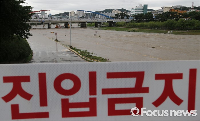 (청주=포커스뉴스) 충청 및 중부지역에 호우경보가 발생한 4일 오후 충북 청주시 무심천 하상도로가 내린비로 잠겨 있다.