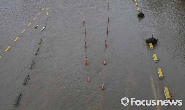(청주=포커스뉴스) 충청 및 중부지역에 호우경보가 발생한 4일 오후 충북 청주시 무심천 하상도로가 내린비로 잠겨 있다.