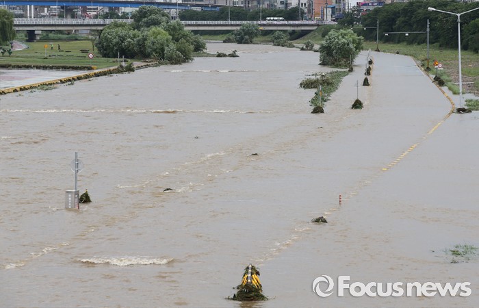 (청주=포커스뉴스) 충청 및 중부지역에 호우경보가 발생한 4일 오후 충북 청주시 무심천 하상도로가 내린비로 잠겨 있다.