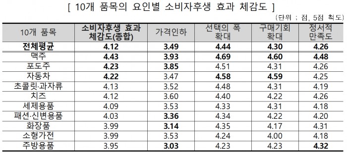 EU산 10개 품목별 소비자후생 효과 체감도는 맥주가 4.43점을 기록했다. 이어 포도주가 4.23점, 자동차 4.22점 등이다. 상대적으로 낮은 제품은 주방용품(3.95점), 소형가전(3.99점), 화장품(3.99점) 등의 순이었다.
