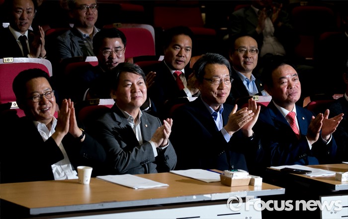 (서울=포커스뉴스) 5일 오전 서울 여의도 국회 의원회관에서 열린 국민의당 성희롱 예방교육에 참석한 박지원(앞줄 왼쪽부터) 비대위원장, 안철수 전 대표, 김성식 정책위의장, 장병완 의원 등 의원들이 문강분 행복한일연구소 대표의 강의를 들으며 박수치고 있다.