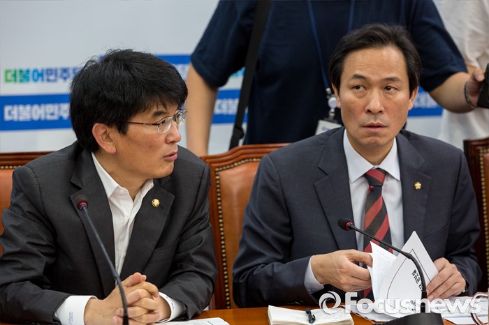 (서울=포커스뉴스) 우상호(오른쪽) 더불어민주당 원내대표와 박완주 원내수석부대표가 5일 오전 서울 여의도 국회에서 열린 원내대책회의에 참석해 대화 하고 있다.