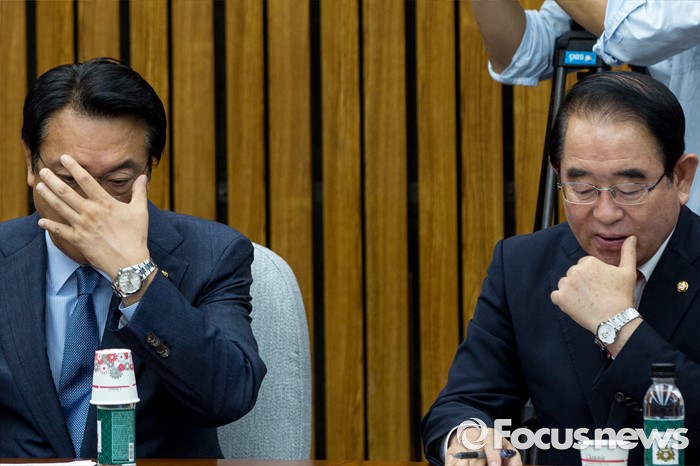 (서울=포커스뉴스) 정진석(왼쪽) 새누리당 원내대표와 박명재 사무총장이 5일 오전 서울 여의도 국회에서 열린 원내대책회의에 참석해 회의시작을 기다리고 있다.