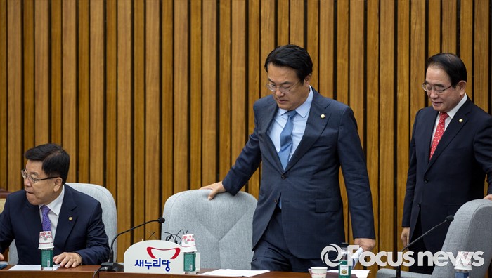 (서울=포커스뉴스) 정진석(가운데) 새누리당 원내대표와 박명재(오른쪽) 사무총장이 5일 오전 서울 여의도 국회에서 열린 원내대책회의에 참석하기 위해 회의실로 들어서고 있다.