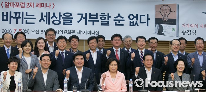 (서울=포커스뉴스) 5일 오전 서울 여의도 국회 의원회관에서 열린 국가미래전략포럼(일명 알파포럼) 2차 세미나에 참석한 원유철 새누리당 의원과 참석 의원들이 기념촬영을 하고 있다.