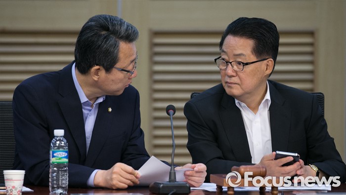 (서울=포커스뉴스) 5일 오전 서울 여의도 국회 의원회관에서 열린 국민의당 의원총회에 참석한 박지원(오른쪽) 비대위원장과 김성식 정책위의장이 대화하고 있다.