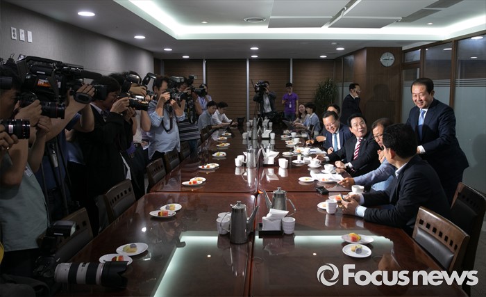 (서울=포커스뉴스) 5일 오전 서울 여의도 국회 의원회관 의원식당에서 열린 남북관계 정상화를 위한 여야 중진 의원 1차 모임에 참석한 국민의당 소속 박주선 국회 부의장과 의원들이 인사하고 있다.