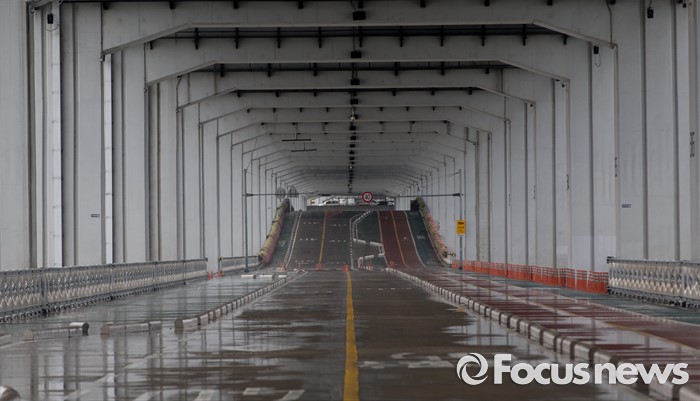 (서울=포커스뉴스) 장마전선이 북상하면서 전국 곳곳에 호우특보가 발표 중인 5일 오전 서울 서초구 잠수교가 통제되고 있다.