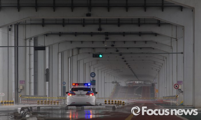 (서울=포커스뉴스) 장마전선이 북상하면서 전국 곳곳에 호우특보가 발표 중인 5일 오전 서울 서초구 잠수교가 통제되고 있다.