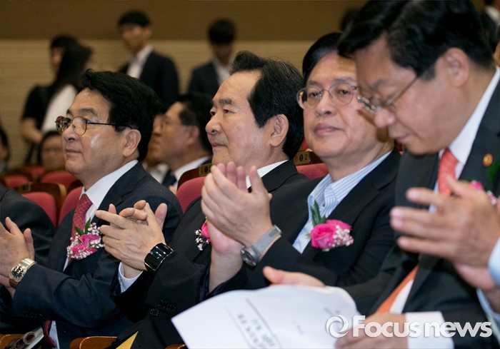 (서울=포커스뉴스) 5일 오전 서울 여의도 국회 의원회관에서 열린 미래성장 경제정책포럼 창립총회에 참석한 심재철(앞줄 왼쪽부터) 국회 부의장, 정세균 국회의장, 정우택 새누리당 의원, 주형환 산업통상자원부 장관 등 참석자들이 박수치고 있다.