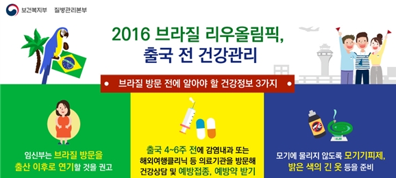 질병관리본부(본부장 정기석)는 제31회 리우데자네이루 하계올림픽(2016년8월5일~8월21일)과 제15회 리우패럴림픽(2016년9월7일~9월18일)을 대비해, 출국자들의 감염병 발생을 예방하고, 국내 유입 및 전파를 차단해 국민의 건강을 보호하기 위해 리우올림픽 감염병 대응 종합계획을 마련했다고 5일 밝혔다.