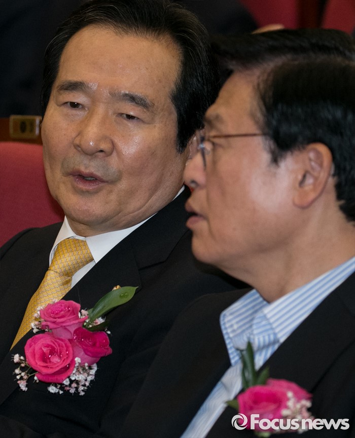(서울=포커스뉴스) 5일 오전 서울 여의도 국회 의원회관에서 열린 미래성장 경제정책포럼 창립총회에 참석한 정세균(왼쪽) 국회의장과 정우택 새누리당 의원이 대화하고 있다.