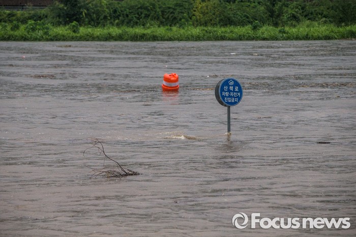 5일 오전 11시를 기준으로 서울·경기도와 강원북부, 충남북부에 호우특보가 발효 중인 가운데 천둥·번개를 동반한 시간당 30mm 이상의 많은 비가 내리고 있다.최고 300mm 물폭탄이 내릴 것으로 예고되어 전국적으로 호우주의보와 경보가 내린 5일 오전 서울 중랑구 중랑천 월릉교 인근 둔치의 시민공원이 물에 잠겨 있다. 2016.07.05 성동훈 기자