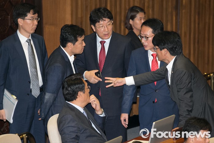 (서울=포커스뉴스) 5일 오전 서울 여의도 국회에서 열린 343회 국회(임시회) 7차 본회의, 정치·외교·통일·안보·교육·사회·문화에 관한 질문에 참석한 이장우 새누리당 의원 등과 김동철 국민의당 의원이 언쟁을 벌이자 정진석 새누리당 원내대표, 권성동 의원과 김도읍 새누리당 원내수석부대표, 박완주 더불어민주당 원내수석부대표, 김관영 국민의당 원내수석부대표가 논의하고 있다.