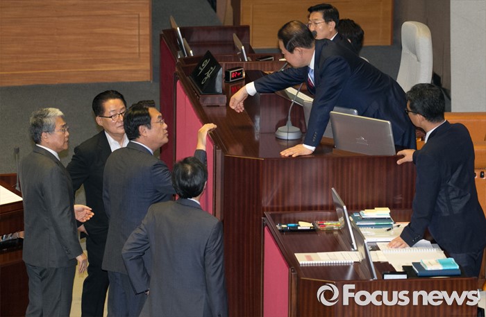 (서울=포커스뉴스) 5일 오전 서울 여의도 국회에서 열린 343회 국회(임시회) 7차 본회의, 정치·외교·통일·안보·교육·사회·문화에 관한 질문에 참석한 이장우 새누리당 의원 등과 김동철 국민의당 의원이 언쟁을 벌이자 정진석 새누리당 원내대표, 우상호 더불어민주당 원내대표, 박지원 국민의당 원내대표와 박주선 국회 부의장이 회의 정회를 논의하고 있다.