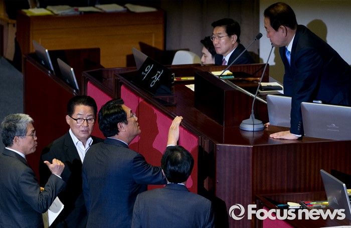 (서울=포커스뉴스) 5일 오전 서울 여의도 국회에서 열린 343회 국회(임시회) 7차 본회의, 정치·외교·통일·안보·교육·사회·문화에 관한 질문에 참석한 이장우 새누리당 의원 등과 김동철 국민의당 의원이 언쟁을 벌이자 정진석 새누리당 원내대표, 우상호 더불어민주당 원내대표, 박지원 국민의당 원내대표와 박주선 국회 부의장이 회의 정회를 논의하고 있다.