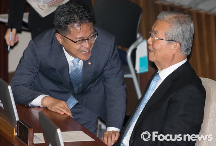 (서울=포커스뉴스) 5일 오전 서울 여의도 국회에서 열린 343회 국회(임시회) 7차 본회의, 정치·외교·통일·안보·교육·사회·문화에 관한 질문에 참석한 김종인(오른쪽) 더불어민주당 비대위 대표와 김정우 의원이 대화하고 있다.