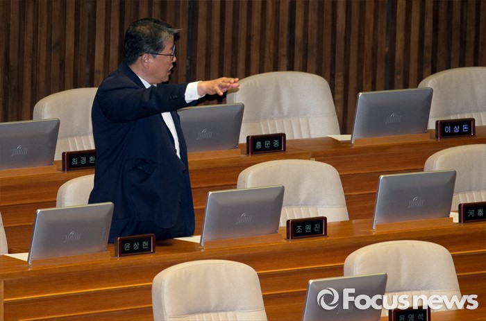 (서울=포커스뉴스) 5일 오전 서울 여의도 국회에서 열린 343회 국회(임시회) 7차 본회의, 정치·외교·통일·안보·교육·사회·문화에 관한 질문에 참석한 조원진 새누리당 의원이 김동철 국민의당 의원의 발언에 항의하고 있다.