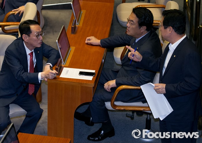 (서울=포커스뉴스) 5일 오후 서울 여의도 국회에서 열린 343회 국회(임시회) 7차 본회의, 정치·외교·통일·안보·교육·사회·문화에 관한 질문에 참석한 정진석(가운데) 새누리당 원내대표, 김도읍(왼쪽) 원내수석부대표, 이장우 의원이 대화하고 있다. 이날 대정부 질문은 이장우 새누리당 의원 등과 김동철 국민의당 의원의 언쟁으로 오전 회의가 정회됐었다.