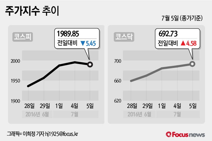 (서울=포커스뉴스) 5일 코스피지수는 전날보다 0.27%(5.45포인트) 내린 1989.85에 장을 마쳤다. 코스닥지수는 전일 대비 0.67%(4.58포인트) 오른 692.73에 마감했다.
