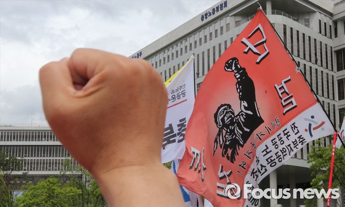 (세종=포커스뉴스) 최저임금위원회 제9차 전원회의가 열린 5일 오후 세종시 정부세종청사 고용노동부 앞에서 한국노총, 민주노총 조합원들이 최저임금 1만원 쟁취 결의대회를 갖고 있다