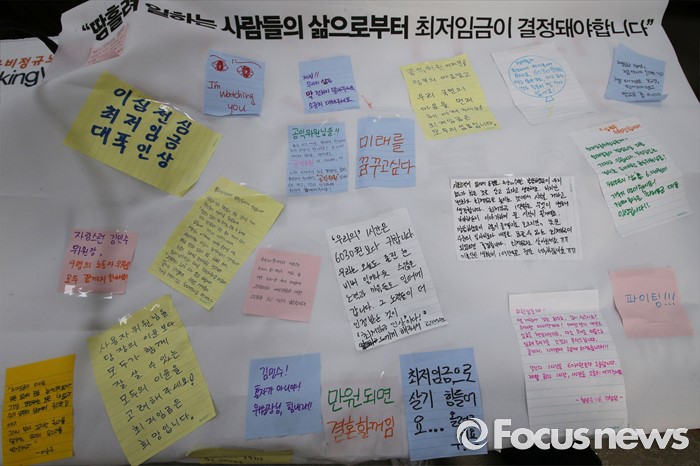(세종=포커스뉴스) 5일 오후 세종시 정부세종청사 고용노동부 최저임금위원회에서 열린 제9차 전원회에서근로자 위원 자리에 청년들의 메모가 붙은 현수막이 올려져 있다.