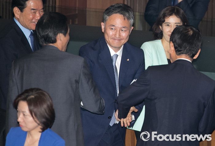 (서울=포커스뉴스) 5일 오후 서울 여의도 국회에서 열린 343회 국회(임시회) 7차 본회의, 정치·외교·통일·안보·교육·사회·문화에 관한 질문에 참석한 표창원 더불어민주당 의원이 질문을 마친 뒤 의원들과 악수하고 있다.
