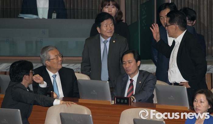(서울=포커스뉴스) 5일 오후 서울 여의도 국회에서 열린 343회 국회(임시회) 7차 본회의, 정치·외교·통일·안보·교육·사회·문화에 관한 질문에 참석한 김종인 더불어민주당 비대위 대표, 우상호 원내대표와 박지원 국민의당 비대위원장, 김관영 원내수석부대표 등이 대화하고 있다.