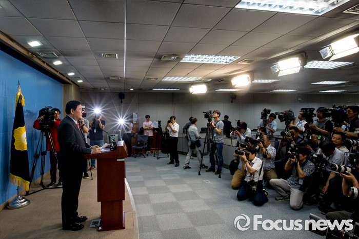 (서울=포커스뉴스) 최경환 새누리당 의원이 6일 오전 서울 여의도 국회에서 새누리당 당대표를 선출하는 전당대회 불출마 선언 하고 있다.