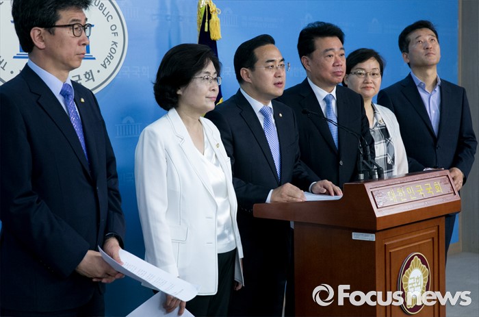 (서울=포커스뉴스) 6일 오전 서울 여의도 국회 정론관에서 미래창조과학방송통신위원회 소속 더불어민주당 의원들이 이정현 전 청와대 홍보수석과 김시곤 전 KBS 보도국장의 세월호 참사 보도통제 논란과 관련 새누리당과 박근혜 정부의 진상규명 협조 촉구 기자회견을 하고 있다.