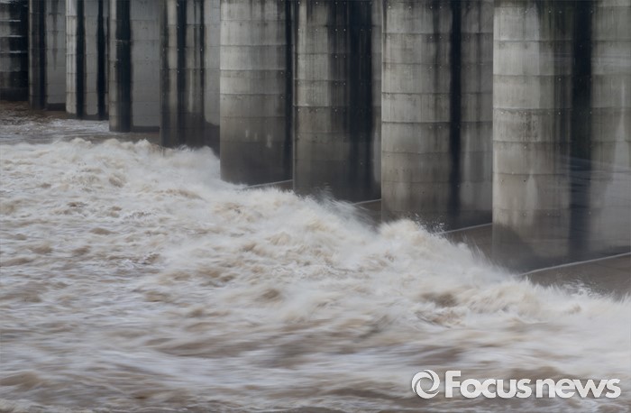 (연천=포커스뉴스) 북한이 황강댐을 방류한 6일 오전 경기도 연천군 군남홍수조절지에서 한국수자원공사가 수위조절을 위해 임진강 강물을 방류하고 있다.