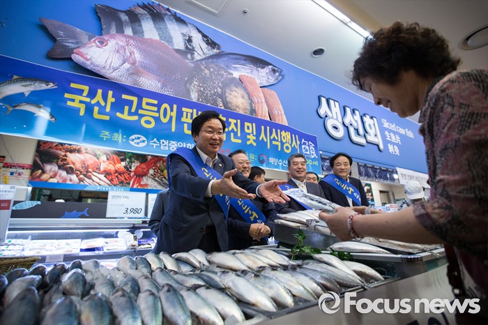 (서울=포커스뉴스) 김영석 해양수산부 장관을 비롯한 수협 관계자 들이 6일 오전 서울 용산구 롯데마트 서울역점을 방문해 최근 미세먼지 논란으로 소비가 위축된 고등어 소비 활성화를 위해 판촉 및 시식 행사에 참여하고 있다. 지난 5월 '고등어를 구울 때 미세먼지가 발생한다'는 환경부의 발표이후 소비둔화로 이어져, 고등어를 찾는 사람이 급격히 줄었다.