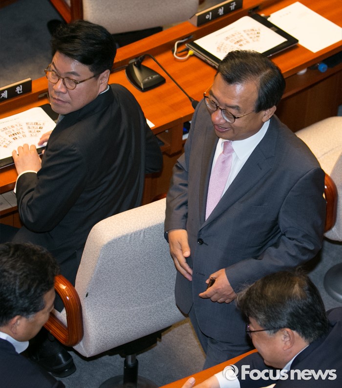 (서울=포커스뉴스) 6일 오전 서울 여의도 국회에서 열린 예산결산특별위원회 전체회의에 참석한 이정현 새누리당 의원이 동료 의원들과 인사하고 있다.