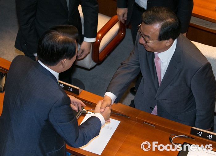 (서울=포커스뉴스) 6일 오전 서울 여의도 국회에서 열린 예산결산특별위원회 전체회의에 참석한 이정현(오른쪽) 새누리당 의원이 동료 의원들과 인사하고 있다.