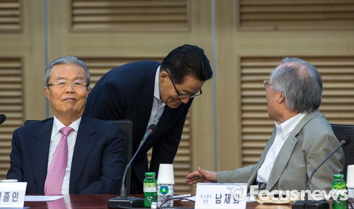 (서울=포커스뉴스) 박지원(가운데) 국민의당 비상대책위원장이 6일 오전 서울 여의도 국회의원회관에서 열린 '따뜻한 미래를 위한 정치기획 창립기념 특강'에 참석해 남재희(오른쪽) 전 노동부 장관에게 인사 하고 있다.
