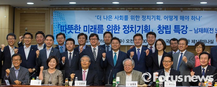 (서울=포커스뉴스) 남재희(앞줄 오른쪽 세 번째) 전 노동부 장관이 6일 오전 서울 여의도 국회의원회관에서 열린 '따뜻한 미래를 위한 정치기획 창립기념 특강'에 참석해 강연에 앞서 야당 의원들과 사진촬영 하고 있다.
