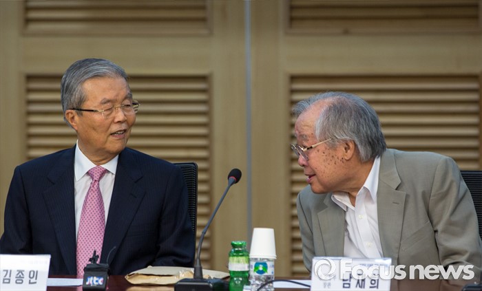 (서울=포커스뉴스) 김종인(왼쪽) 더불어민주당 비상대책위 대표와 남재희 전 노동부 장관이 6일 오전 서울 여의도 국회의원회관에서 열린 '따뜻한 미래를 위한 정치기획 창립기념 특강'에 참석해 대화 하고 있다.