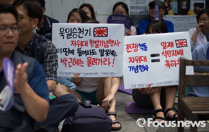 (서울=포커스뉴스) 6일 오후 서울 종로구 주한일본대사관 앞에서 열린 일본군 '위안부' 문제 해결을 위한 제1238차 정기 수요집회에서 학생들이 박근혜 대통령을 비판하는 피켓을 들고 있다.